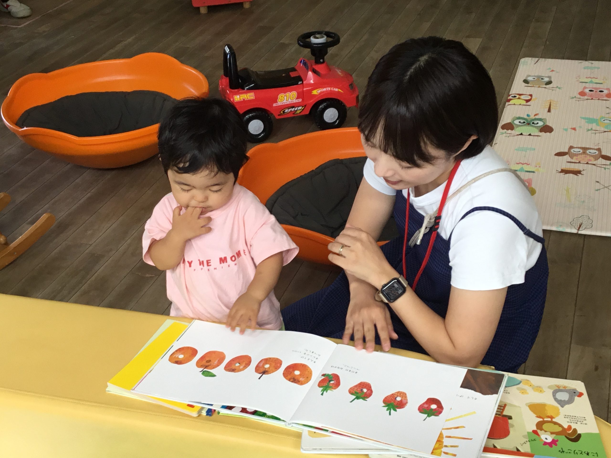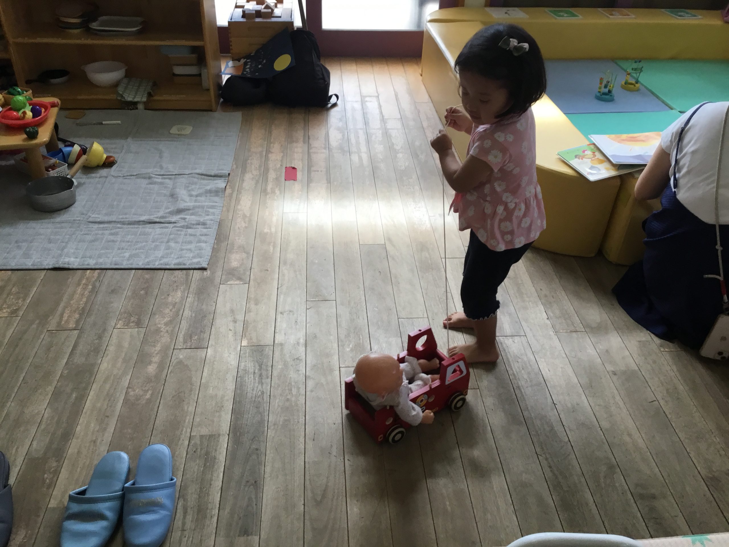 好きな玩具で遊ぶ時間には、絵本を読んだり、おままごとをしたり、車のおもちゃを走らせたりと、思い思いに遊ぶ姿が見られました。おうちの方やお友だちと笑顔で過ごす姿もとても可愛らしかったです。